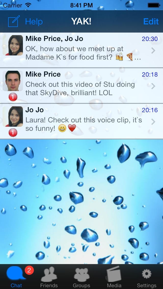 With no extra cost Yak comes with: Group Chats, Read Receipts, Photos, Movies, Voice Messages, Full Contact/Group Management, Location Maps and a neat Route Finder – all for no extra charges - ever! Yep, no SMS or MMS charges whatsoever.