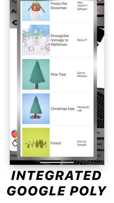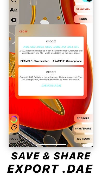 Any drawing created within this app can be exported as a Collada (.dae) 3D model, and any .OBJ, .STL, .USDZ (and many others) file can be imported into your scene. I've built in Google's Poly warehouse right into the app too - letting you explore creations uploaded to poly.google.com by other users. In this way, it behaves like the warehouse on Sketchup.