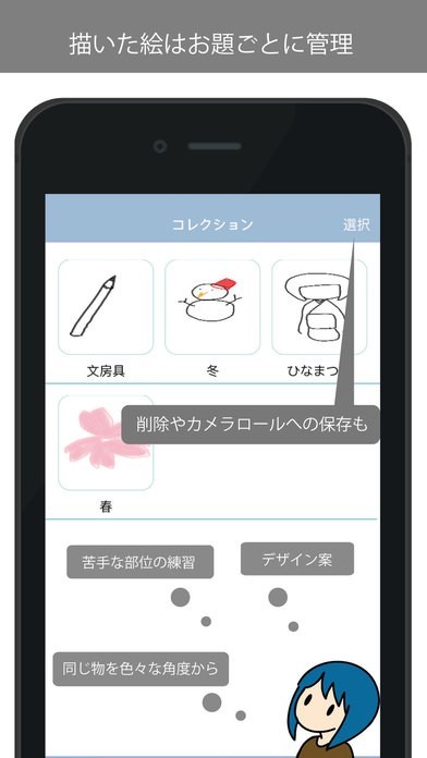 絵が上手なあの子や、想像力豊かでアイディア豊富なあの子が羨ましいなーと思っている女子、少しの空き時間で自分磨き始めてみませんか?この「ひらめきスケッチ ideaDASH」ならそのトレーニングが可能です!ランダムに出されたお題に対して思いついた絵をパッと描くアプリで、操作は直感的で簡単だし、続けていれば想像力豊かになる上、絵力も上達します!描いた絵はアプリ内のアルバムにコレクションされて、SNSにアップしたり、友人に送る事も可能です。なので、友達付き合いの多い子でもアプリを最大限に有効活用できます!特にルールはないので堅苦しくない!好きなだけ描いてメキメキ自分磨きしましょう!