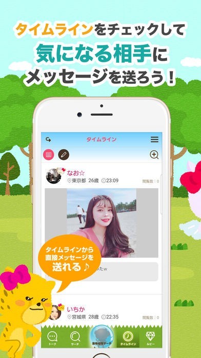 利用しているユーザーのタイムラインを閲覧することができるので、自分の好みの相手を見つけたらタイムラインから直接メッセージを送ることができます。チャットなので気軽にやり取りできます。