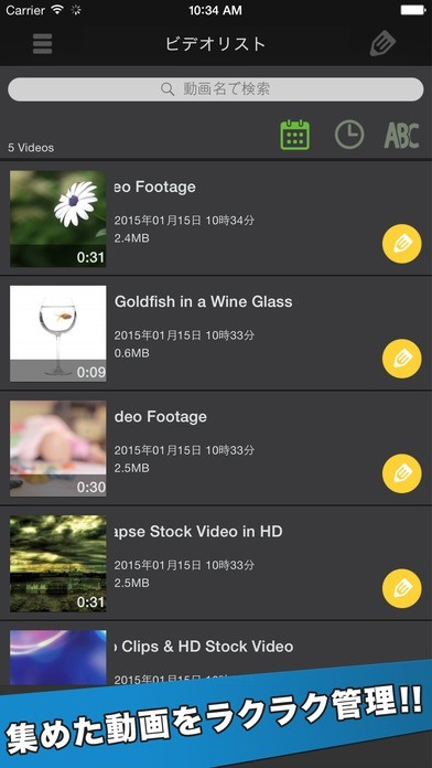 動画は日時、動画時間、動画名でソート(並び替え)も出来ます。