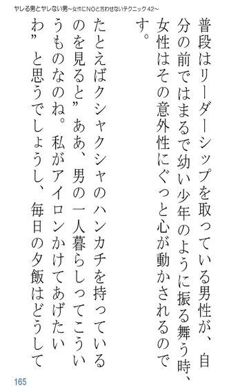 たとえばクシャクシャのハンカチを持っているのを見ると”ああ、男の一人暮らしってこういうものなのね。私がアイロンかけてあげたいわ”と思うでしょうし、毎日の夕飯はどうしてもコンビニの弁当になってしまうんだという話をすれば”たまには私がご飯でも作ってあげたいわ”と思うでしょう。