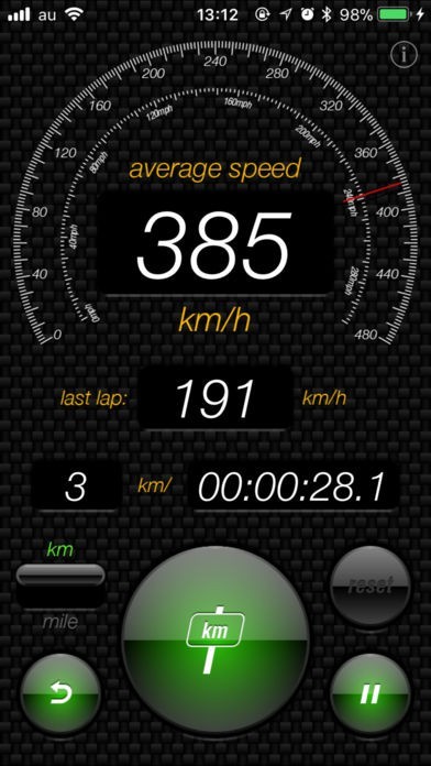 「startボタン」をタップ後、1kmごとに「kmボタン」もしくは1マイルごとに「mileボタン」をタップすることで、「average speed枠」に平均時速が表示されます。