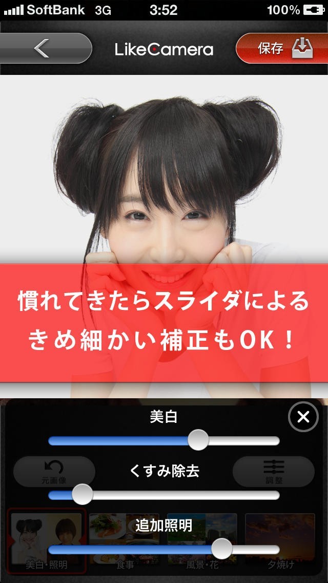 人物は美肌に、料理はおいしそうに、風景はきれいに、夕焼けはドラマチックに。照明やホワイトバランスなど、難しいことを知らなくてもワンタッチでLikeカメラ(ライクカメラ)がプロのような写真に変換してくれます。もちろん、慣れてきたらこだわりの独自パラメータ調整も簡単。もう少し美肌に、もう少し鮮やかに、など自由自在です。