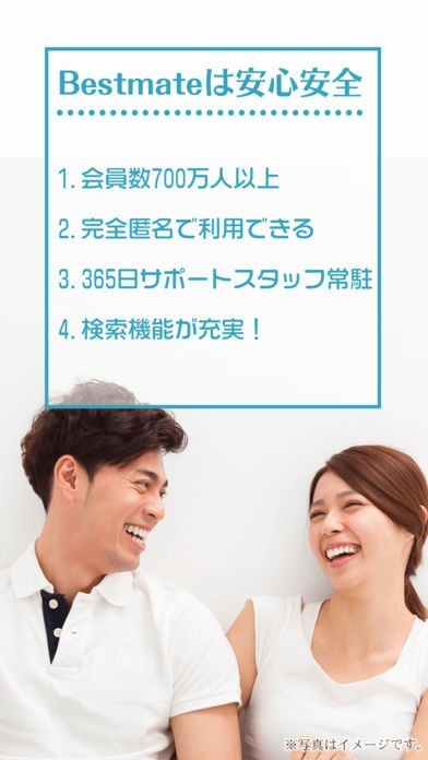 「BestmateJp- 出会いアプリのベストメイト」は、大手老舗の出会い系サイトASOBO提供会社がプロデュースしている出会いアプリです。「BestmateJp- 出会いアプリのベストメイト」は、メールアドレスや電話番号の登録の必要がないので、気楽に開始することができます。それだけではなく、「BestmateJp- 出会いアプリのベストメイト」は、365日多くのサポートスタッフが常駐しているので、安心してサービスを利用することができます。