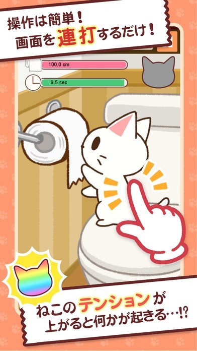 このゲームは猫ちゃんがトイレでうんちをしている時に、トイレットペーパーが長く出ていたので一生懸命元に戻す内容です。タップ連打だけでゲームを行う事ができるので覚える事も少ないです。