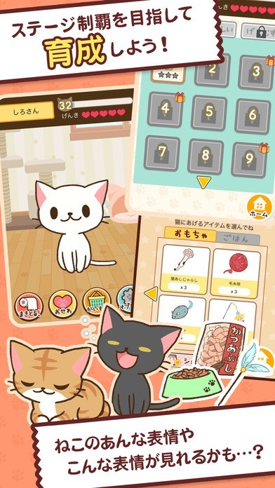 猫のレベルアップを行うには、トイレのミニゲームのほかにも、おもちゃで遊んであげるという方法があります。レベルが上がると猫のしぐさを見る事ができるので可愛い様子を見る事ができます。
