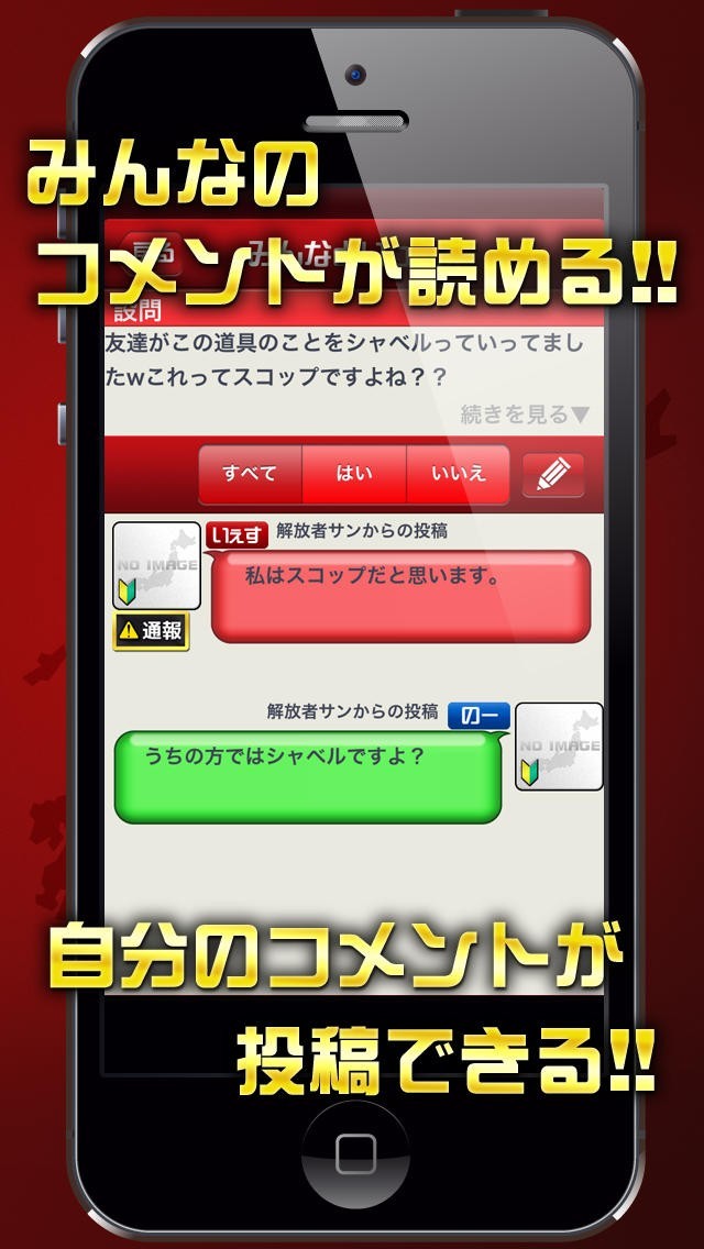 このアプリでは自分の感覚は世間一般の比べてどうなのかを知ることが出来ます。よって社会常識がないのではないかと不安になっている方が使うといいでしょう。 例えば「これはシャベルといいますよね?」という質問にイエスかノーで答えます。結果は円グラフで表示されて、自分が多数派か少数派かを知ることが出来ます。 これによって、他の方にも聞いてみることで話題を作ってくれるので、沈黙に困っているような場合に利用すると便利です。 さらにはコメントも書けるので、なざそうなのかというような深い理由までもしっかりと知れて学習にもなります。
