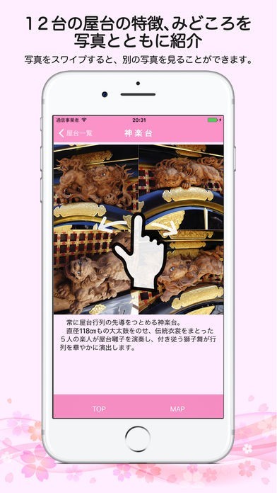 本アプリでは、12台の屋台の紹介をはじめ、からくり奉納、夜祭、御巡幸などを写真と地図入りで紹介しています。