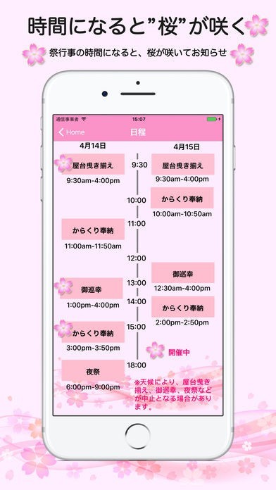 日程画面では、"桜"の花が、当日"今”観る事ができる行事を教えてくれます。