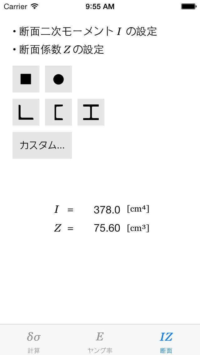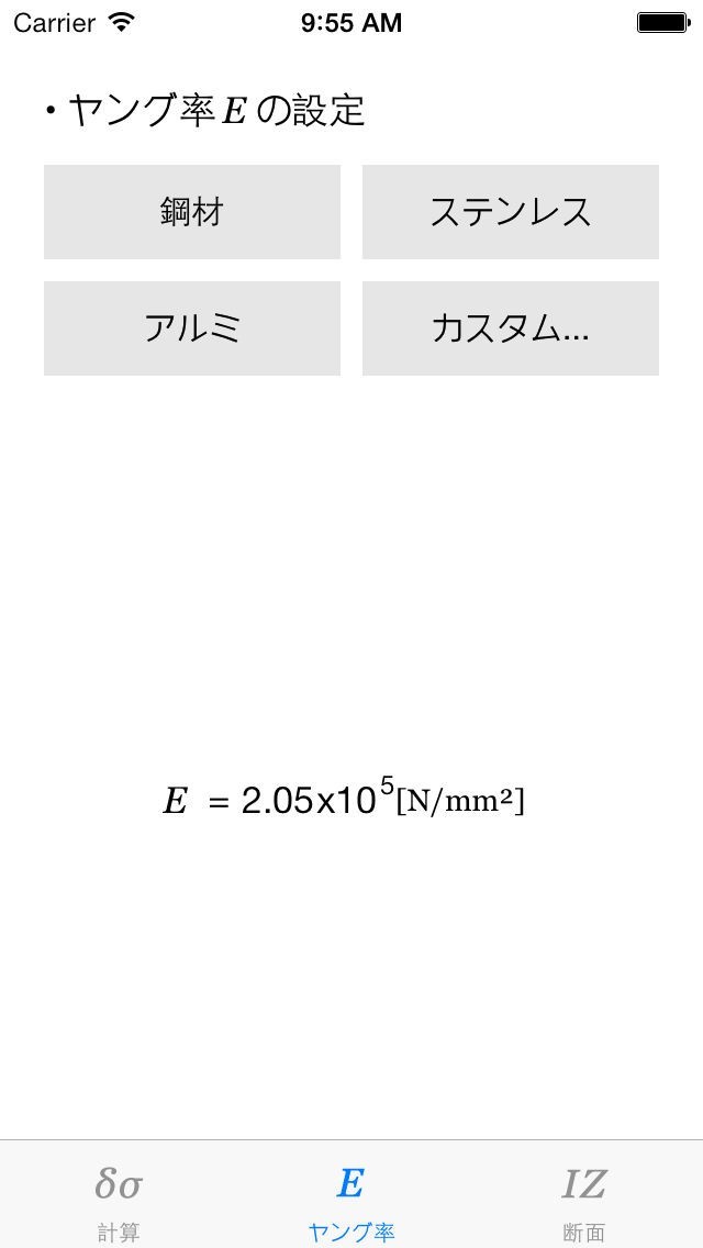 ヤング率機能は、使用する材質を選ぶことができます。鋼材とステンレス、アルミがあります。カスタムをタップすると、値の入力が可能になります。許容応力度を知りたいときに役立ちます。