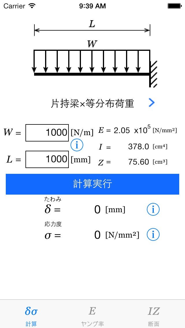 建築構造物や土木構造物の数値を入力すると、たわみ量と応力度が出る