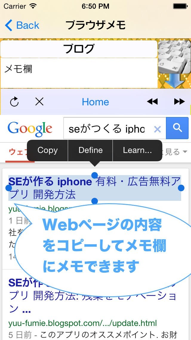 の上部にメモ部分が用意されていて、下部分がブラウザとなっていて簡単にメモがとれる!