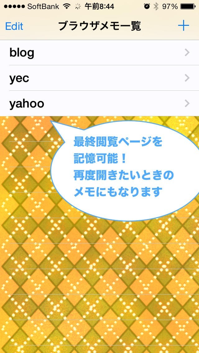 このアプリはアプリの上部にメモ部分が用意されていて、下部分がブラウザとなっているので、調べ物をしながら覚えておきたいことなどを他アプリをわざわざ起動することなく書き残しておくことが出来ます。 メモには題名をつけることができ、保存しておくことができ、「ブラウザメモ一覧」であとからチェックすることが出来ます。 具体的な使い方としては、IDとパスワードをメモするのにつかったり、やらなければならないことを記載しておくことで、忘れないようにしたり、各サイトに行って価格を記載しておいて比較していくというような使い方をすることが出来ますし、他にもアイデア次第でいろいろな方法がまだまだあるでしょう。