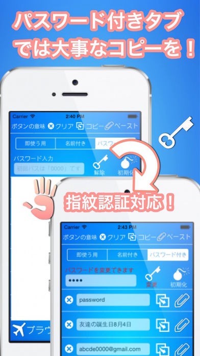メモをパスワード付きで保存しておきたい時は「コピーペ2」が使えます。テキスト情報を指紋認証で保護できるので簡単にセキュアな保存が可能です。操作も簡単ですから、メモから保存まで手早くできるのもポイントです。