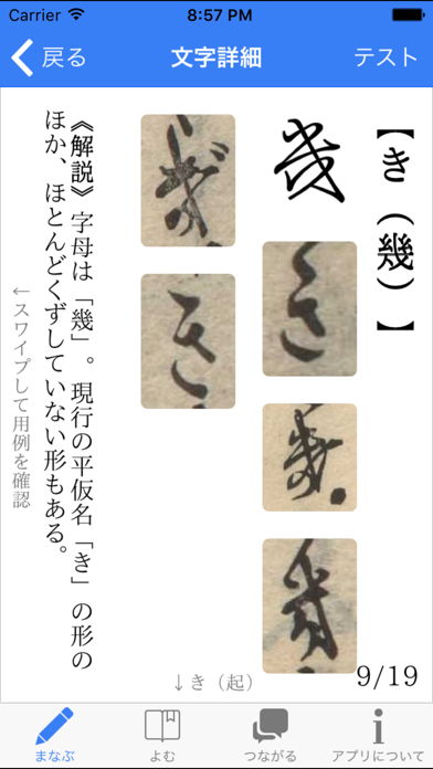 3,000枚を超えるくずし字の用例画像を参照しながら、現在使われることのない仮名文字(変体仮名)や草書体漢字の読み方を学習するための機能です。付属のテスト機能を使えば、簡単に学習の成果を実感することができます。