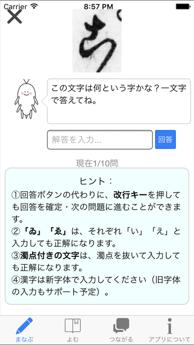 「つながる」機能は、ネットワークでを通じてくずし字を学ぶ他のユーザーとコミュニケーションを取るためのソーシャル機能です。読めない文字をカメラで撮影して、オンラインで読み方を質問することができます。