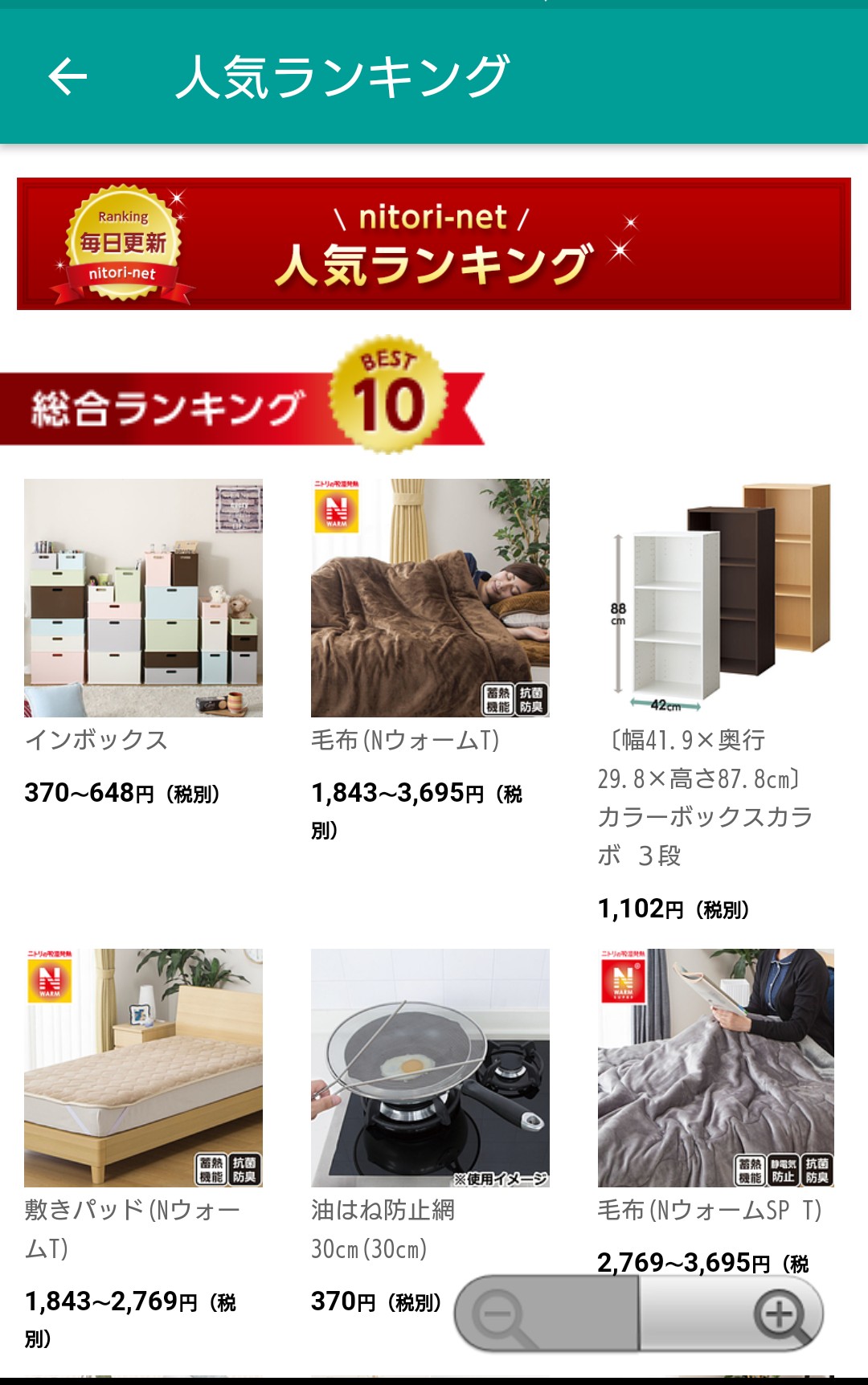 「ニトリアプリ」では、特集のオススメ家具や人気ランキングを確認することができます。