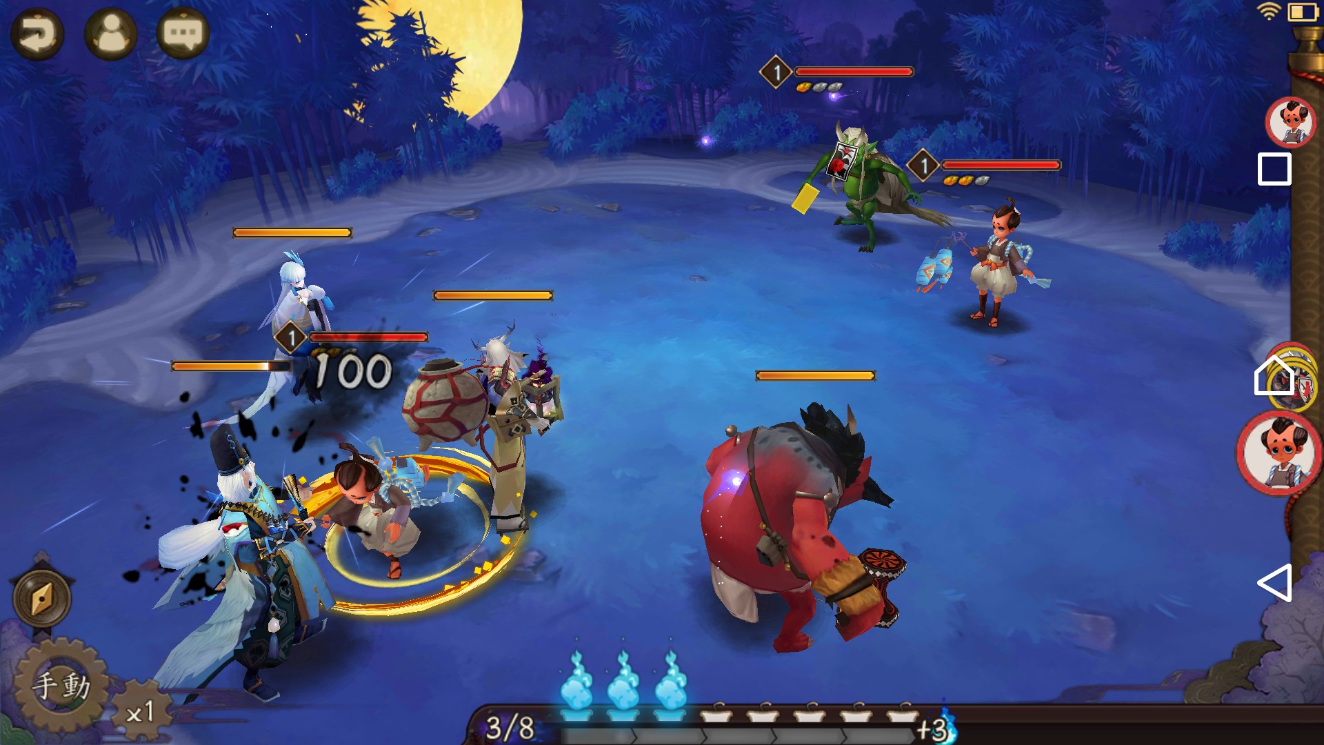 通常攻撃か特殊攻撃をタップして、ターゲットを指定すると、そのターゲットにダメージを与えることができます。ただし、特殊攻撃を可能にするには、画面下の水色の炎「鬼火」を一定数消費する必要があります。鬼火はダメージを受けたりターンを終了したりした段階で増え、最大8つまでためることができます。すぐたまりますので、惜しまずどんどん使っていきましょう。より強い攻撃を行ったり、防御の術が使えたり、さまざまな効果があります。