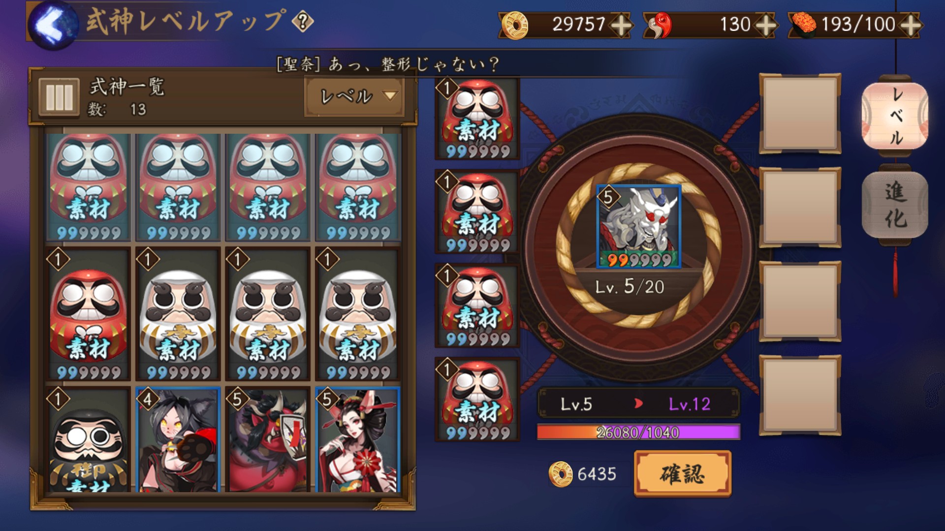 式神は、戦闘で経験値を得られるのはもちろんですが、素材を合成して一気にレベルを引き上げることもできます。特に注目したいのが、とても弱い式神「ダルマ」。戦闘では使えませんが、合成素材として使うと、大きな経験値をくれるありがたい存在です。見つけたら、強くしたい式神に合成しましょう。