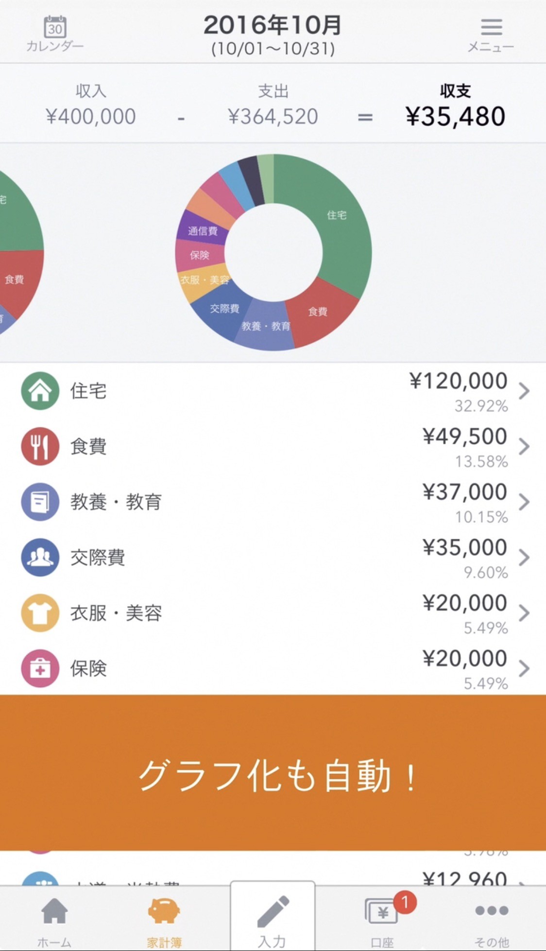 入力の手軽さが魅力で、基本的な情報登録をきちんとしておけば、毎日の支出入力を5分で終わらせることができます。