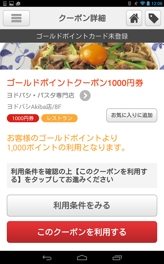 アプリトップから、ヨドバシ店舗などで利用できるクーポンの情報を見ることができます。