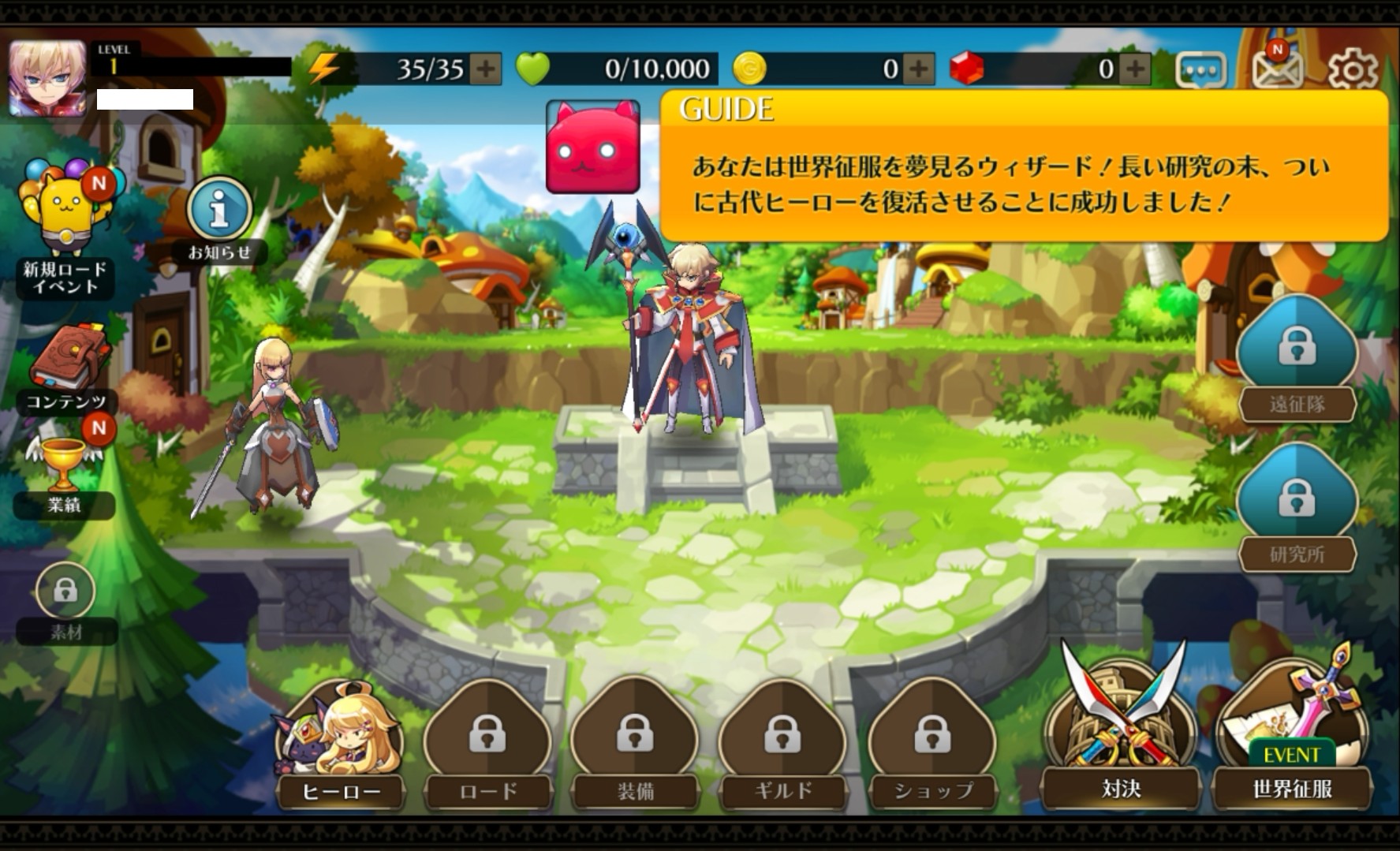 オープニングムービーが終わると、ホーム画面に切り替わりました。さっきの主人公は「世界征服を夢見るウイザード」で、さっきの「ホワイトナイトクリス」という女性は主人公が長い研究の末召喚に成功した、古代のヒーローのようです。あの女性は古代人だったのですね!
