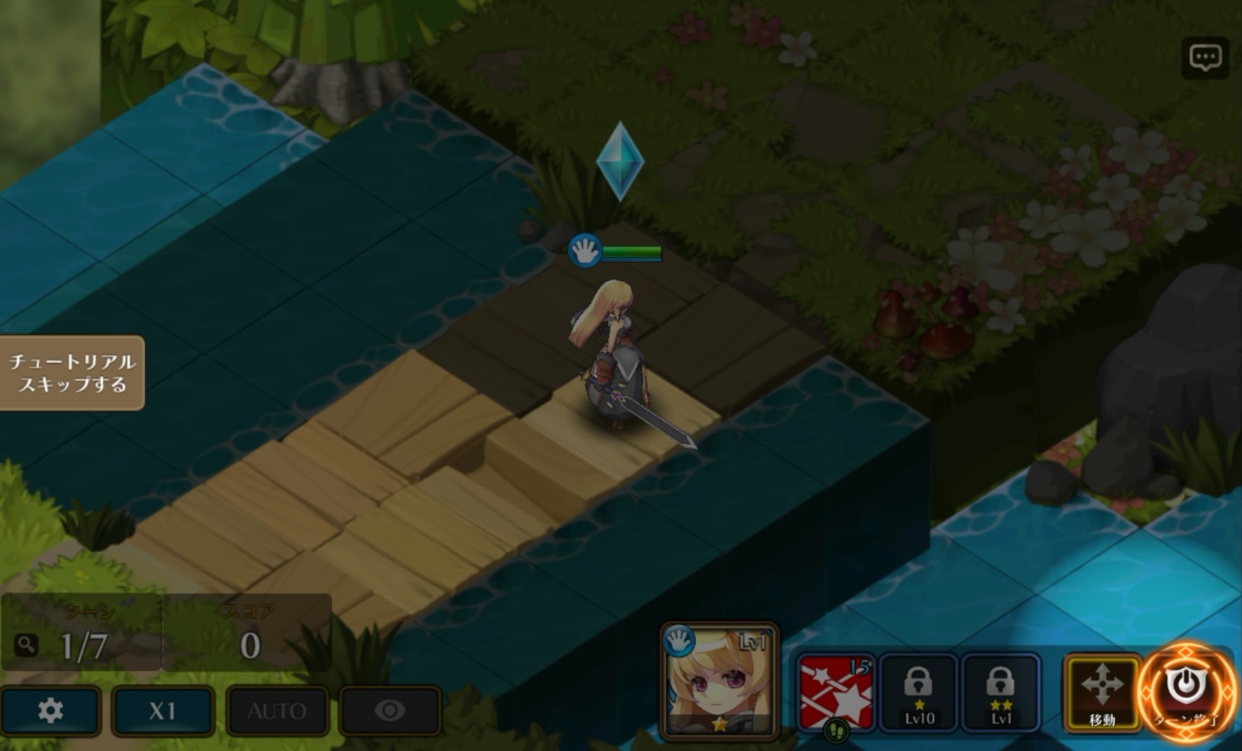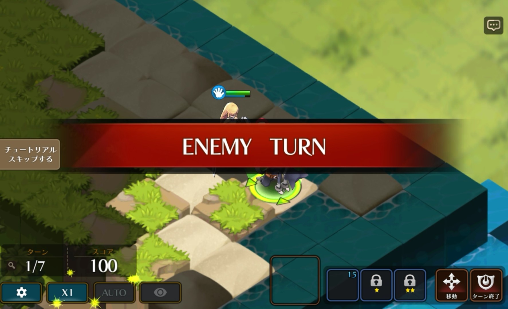 明るくなっている場所をタップすると、「ホワイトナイトクリス」がタップした場所に移動しました!移動するだけではターンは終了しないようなので、「ターン終了」をタップして自分のターンを終了させます。