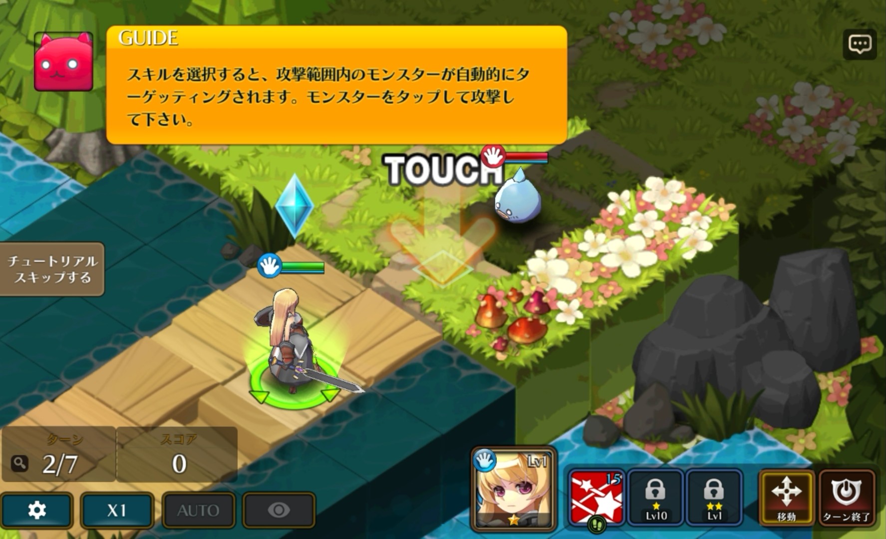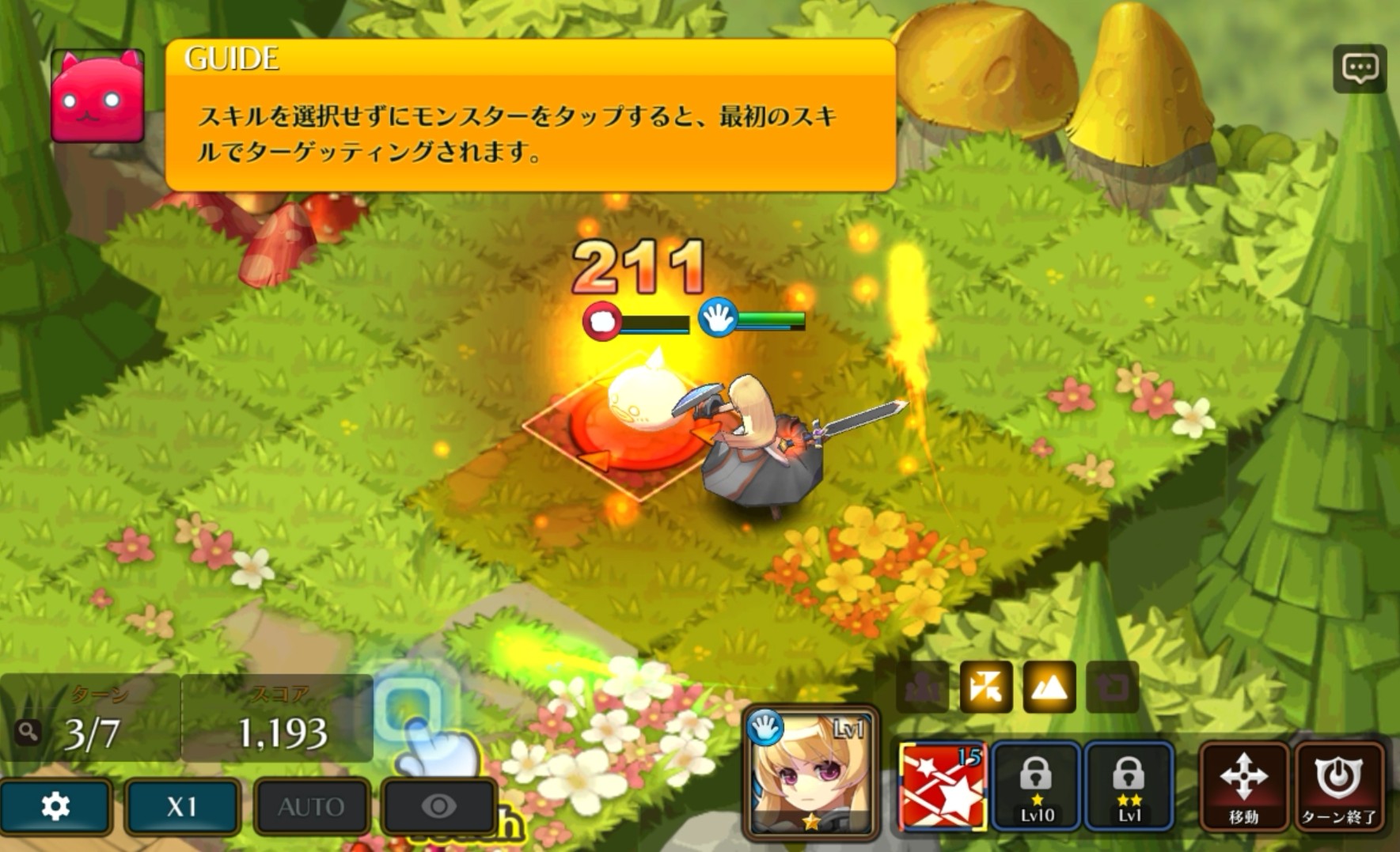 モンスターがスキル範囲内にいないときは、左下のスキルをタップするだけで、モンスターを攻撃できる範囲まで自動で移動するようです。タップするだけで勝手に移動してくれるだなんて、これは便利ですね!さっそく、左下のスキルをタップしてみます。