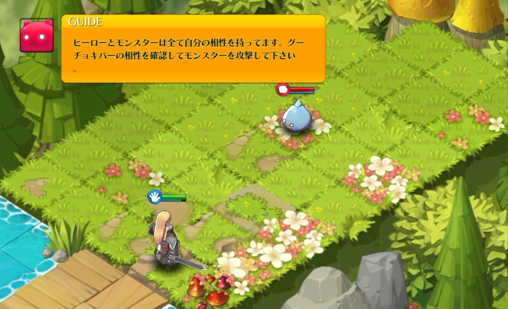 モンスターを倒しましたが、また新たなモンスターが出現しました。操作するヒーローとモンスターはそれぞれ「グー・チョキ・パー」のいずれかの属性を持っていて、属性には相性があるようです。