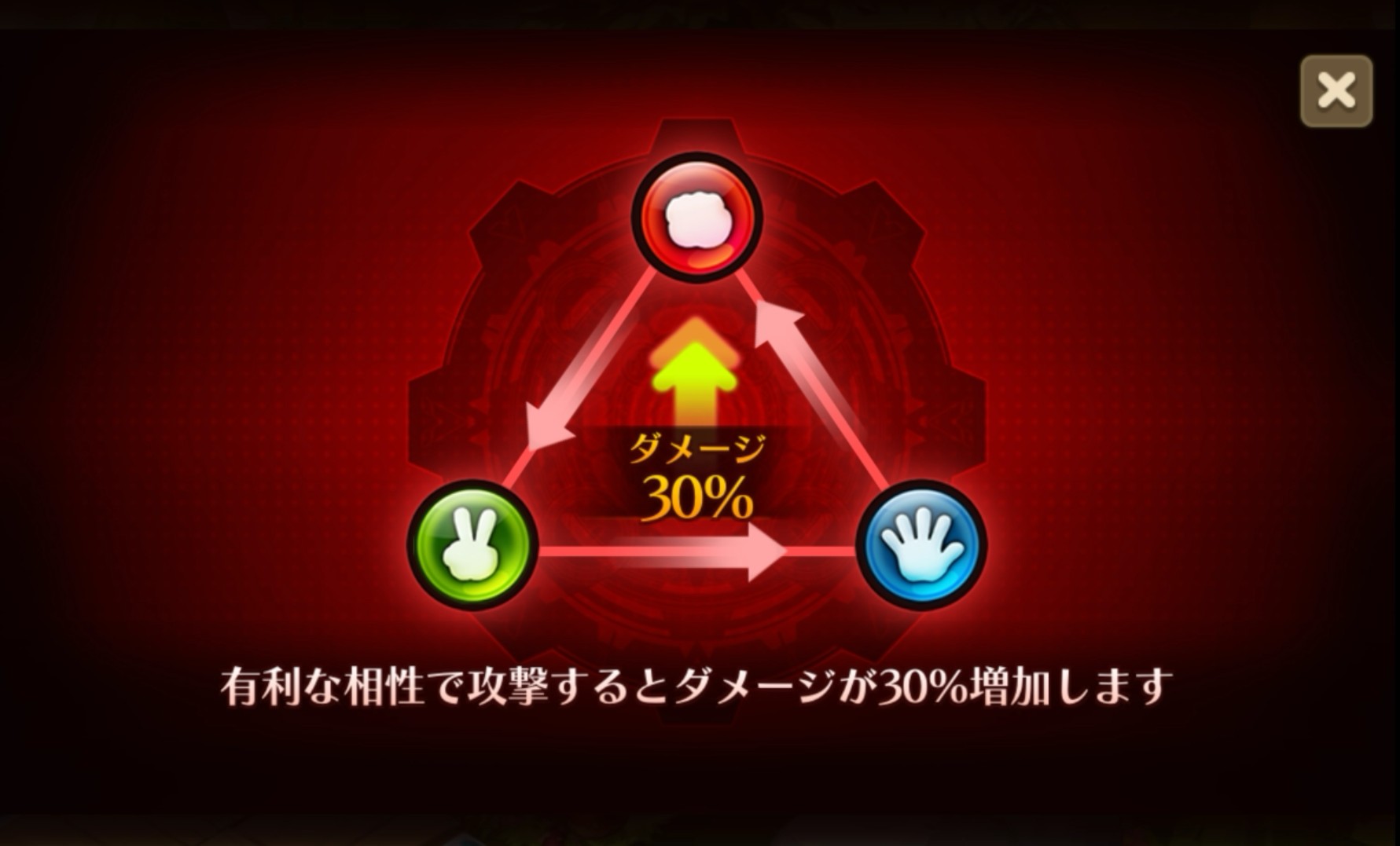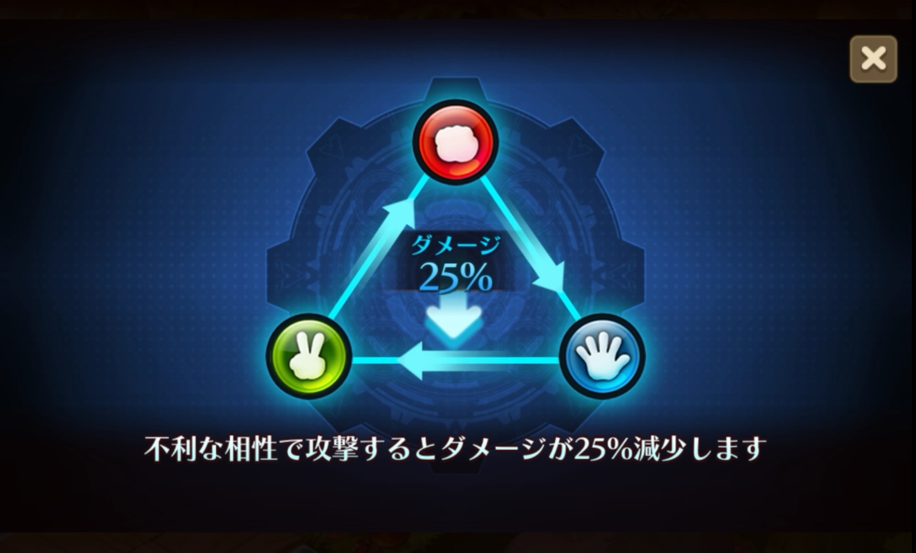 属性の相性の画面が表示されました。じゃんけんで負ける属性相性は不利、勝てる属性相性は有利、ということですね。分かりやすくて覚えやすいです!