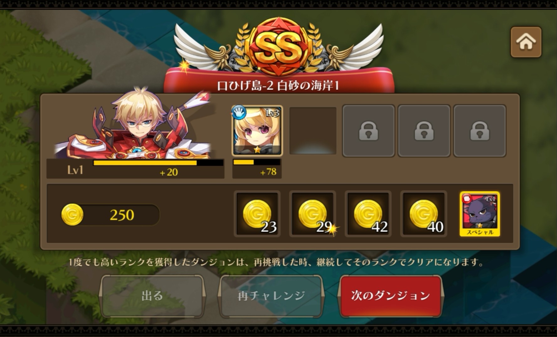 ステージの敵をすべて倒すと、ステージクリア出来ました!ステージクリアの評価には「S」「SS」の4つの判定があり、判定によってステージクリアで入手できるアイテムが異なるようです。判定が高いほど、入手できるアイテムが増えるので、ぜひとも「SS」判定を目指していきたいところですね!