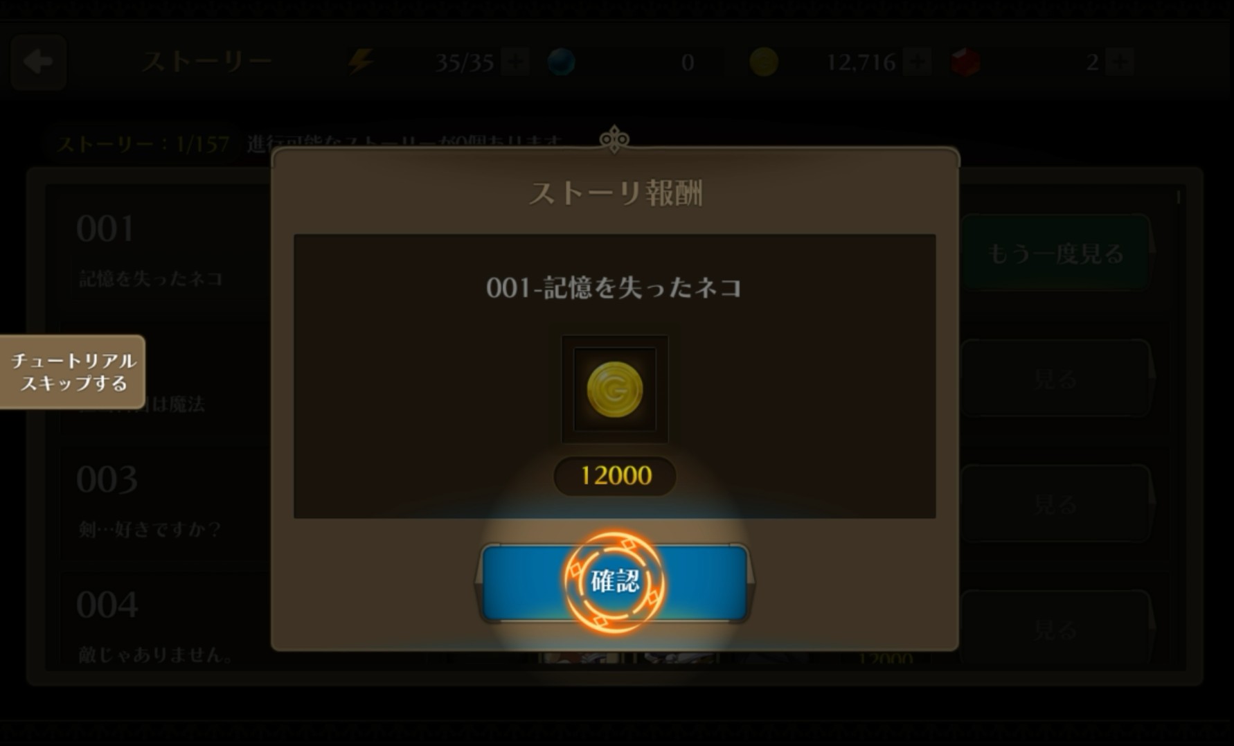 ストーリーを読み終わると、報酬が入手できました!読むだけでコインが入手出来るなんて、ラッキーですね!