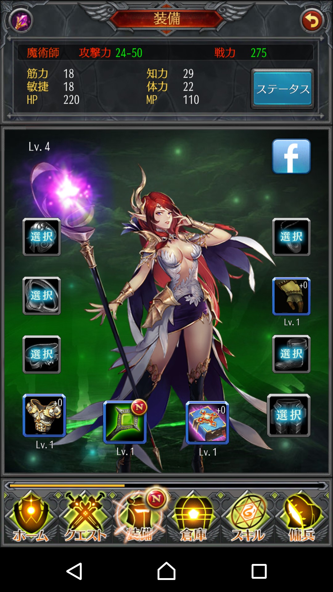 新しい装備が手に入っていたら、ホーム画面の装備アイコンに「N]の文字が点いているのでチェックして装備を整えてあげましょう。