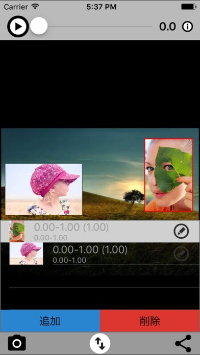 まずはベースとなる動画を選びます。あとは、中に入れる動画を選ぶだけ。中に入れる動画は複数選ぶことができ、設置する位置、大きさ、開始~終了時間、音量など自由に設定できます。「追加」「削除」ボタンで編集できるので、自分の好きな動画を好きな場所に、簡単に追加していくことができます。