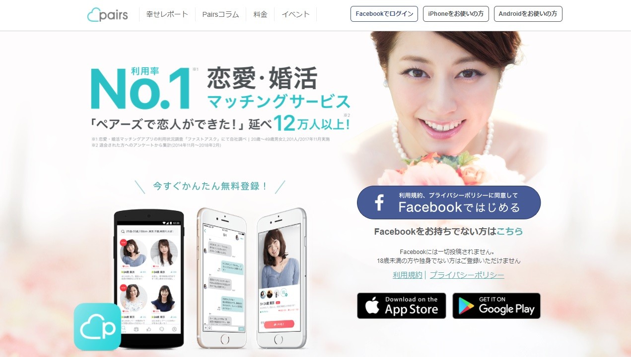 累計登録ユーザー数が700万人を突破した人気出会い系サイト「Pairs」。年齢や職業、出身地だけでなく、結婚への考え方や趣味、興味のあることなど豊富な検索機能から相手を探すことができます。実名が必要となるFacebook連動型の登録方法や24時間365日の徹底した監視体制によって、サクラを排除した安全なやり取りが可能です。