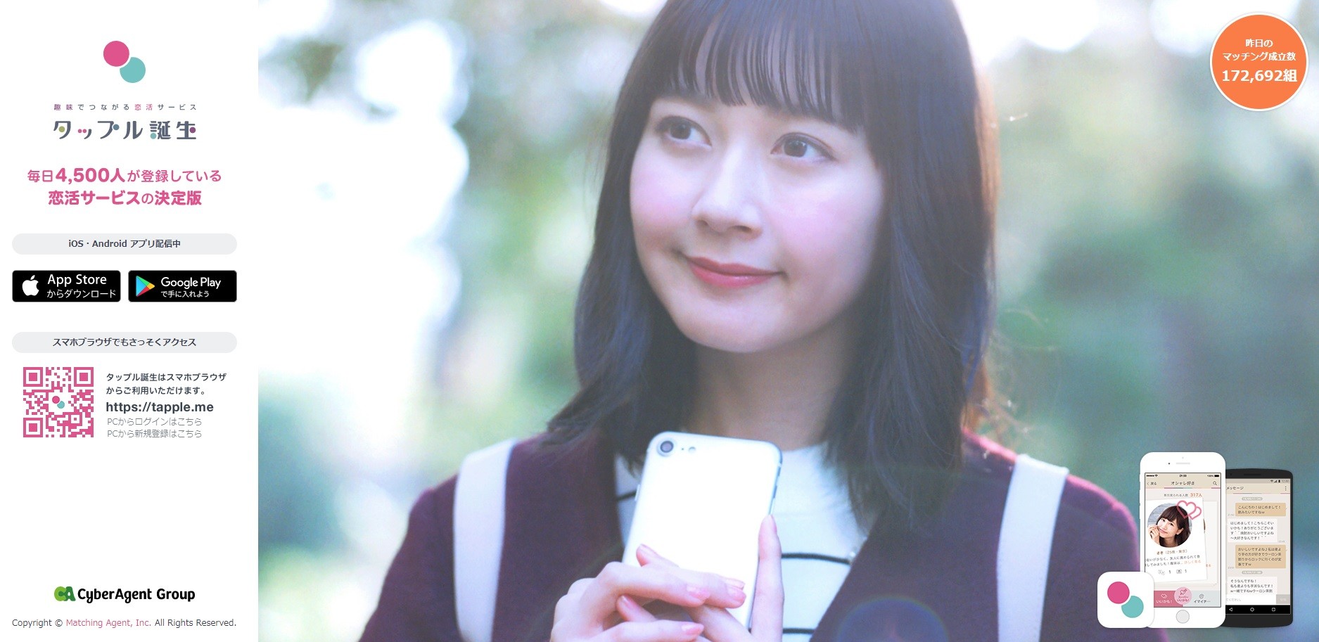 アメーバブログなどを運営するサイバーエージェント社が2014年より提供開始した出会い系サイト。数々のメディアにも取り上げられ、高い認知度から、日々4,500人規模で登録者数が増加しています。大企業運営による万全の監視体制によって、怪しいユーザーや不適切なやり取りを徹底的に排除。身分証明書による年齢確認制度もあるため、サクラも登録しにくく、安全に異性とのやり取りを楽しむことができます。