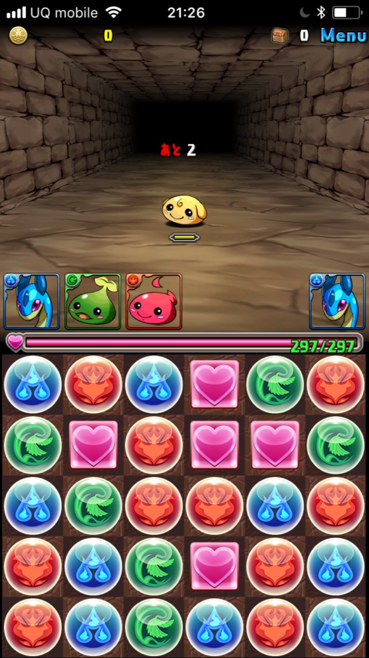 最初のステージでは一緒に戦うモンスターが3体です。事前に選択したドラゴンがリーダーのモンスターとなり、そのドラゴンが持つスキルを武器にダンジョンで戦います。リーダースキルや入手アイテムを確認したい時は、画面右上にあるメニューをタップしましょう。