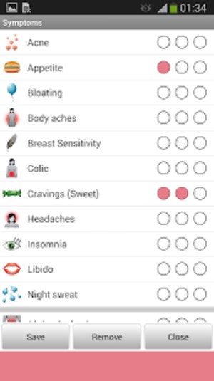 症状もニキビ、むくみ、筋肉痛、生理痛など80項目以上の中であてはまる項目を選べ、簡単に入力できたります。