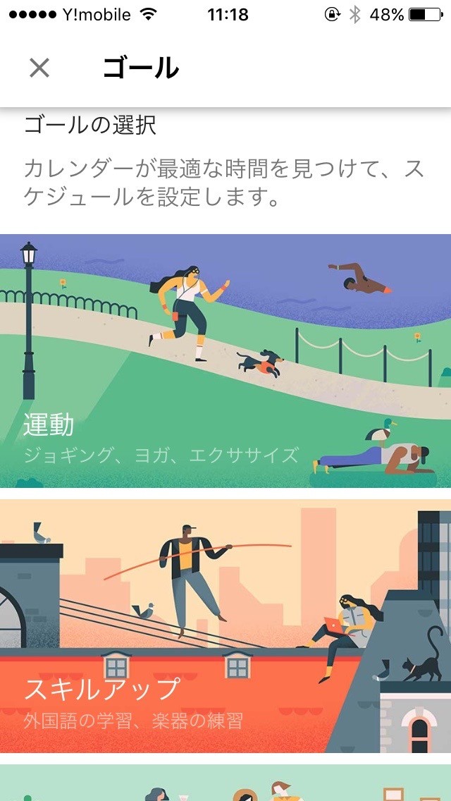 画面右下の十字マークをタップすると、”ゴール” というのがありますが、これはカレンダーがスケジュールを見ながら、空いた時間を探して自分の目標のために費やせる時間を教えてくれるものです!