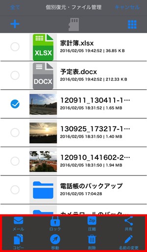 また、アプリ内のファイルを個別に選択してバックアップ/復元することができます。