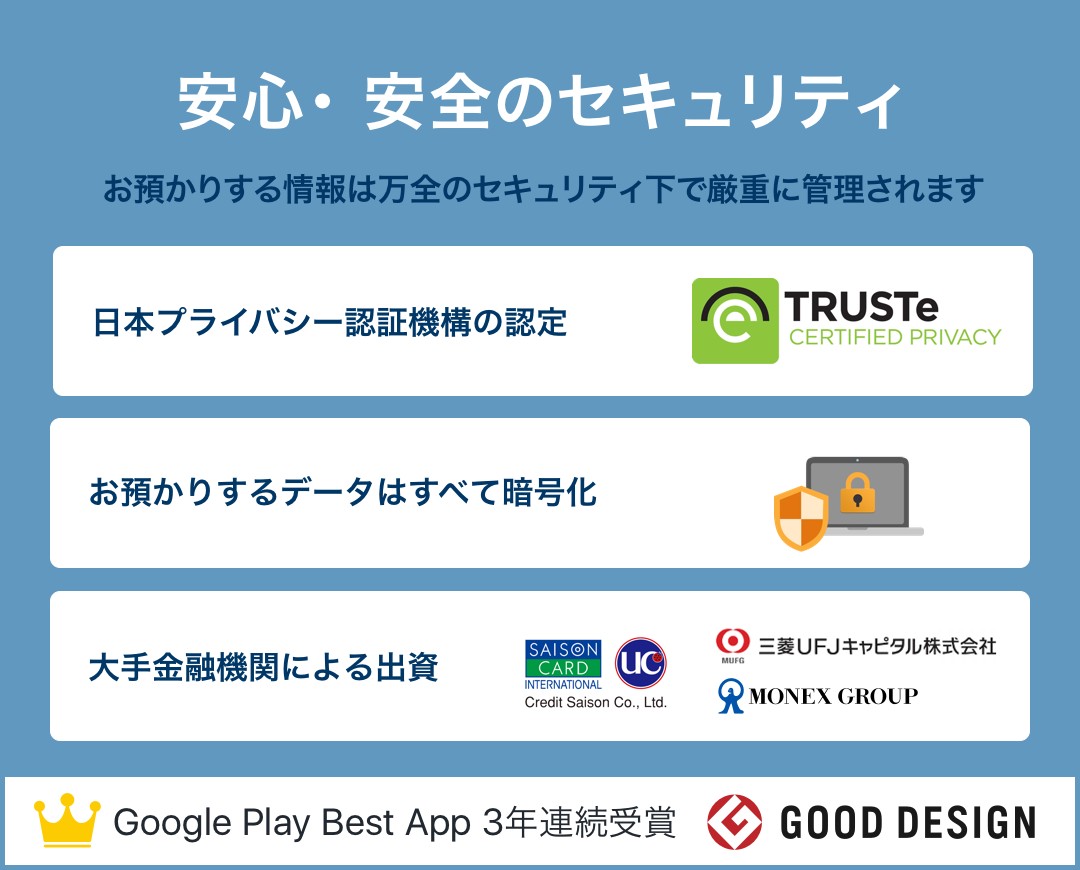 他にもTRUSTe認証を取得したり、SSLを利用して通信を暗号化したりとセキュリティには力を入れています。セキュリティ面でも安心して利用できるのが、「マネーフォワード」の人気の秘訣でもあります。