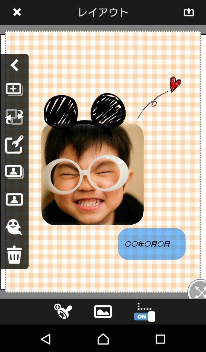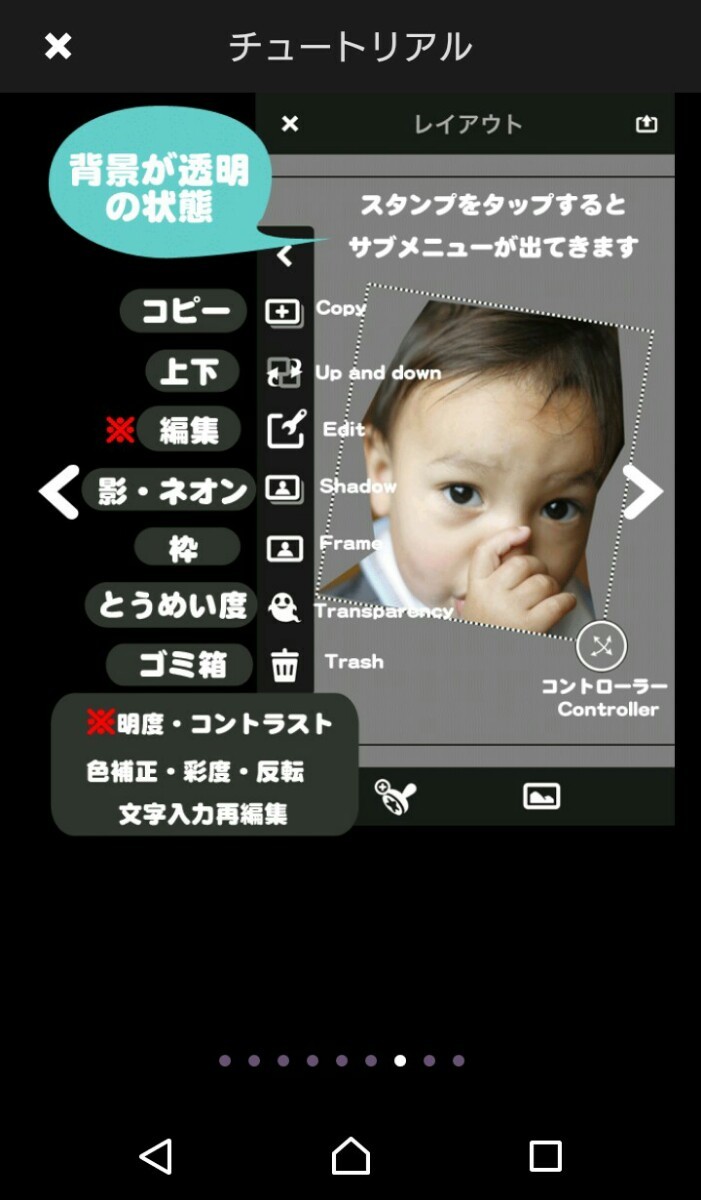 加工した画像は、「アルバムに保存」「Facebookに投稿」「LINEで送る」「メールで送る」の4つが選択できます。サブメニューでは不要なスタンプを削除したり、透明度を調整したりできます。細かな加工があるので最初は慣れないかもしれませんが、使いこなせると素敵な写真が作れるので楽しめるアプリです。