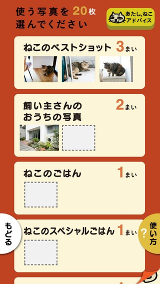 「思い出ぽん!」には、ねこ用、犬用のそれぞれに男の子、女の子用の合計4種類があります。現在は、それに加えて「おれ、ねこ 木村カエラVer」、「あたしのすきなもの(オリジナルソング)」、「うちのかぞく(かぞく用)」があり、合計7種類があります。まずは、この中からねこ・犬、性別ごとにアプリを選ぶところからはじまります。アプリを選んでダウンロードしたら、さっそく起動してみましょう。フォトムービーを作るには、アプリを起動した後、まず「つくる」をタップします。次に表示されるテンプレート画面で、愛猫・愛犬の写真を選んで埋めていきましょう。フォトムービー作成には、全部で20枚の写真を使います。例えば、ねこのベストショット3枚、飼い主さんのおうちの写真2枚、ねこのごはん1枚、ねこのスペシャルごはん1枚、といった具合です。右上にある「アドバイス」のボタンをタップすると、使い方のヒントが表示されます。初めて使うときには、一度目を通しておくとよいでしょう。