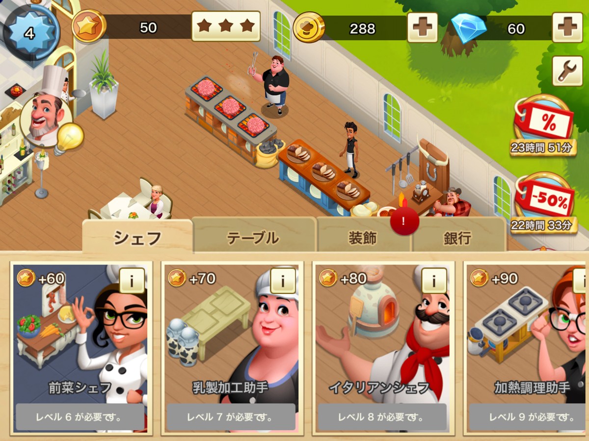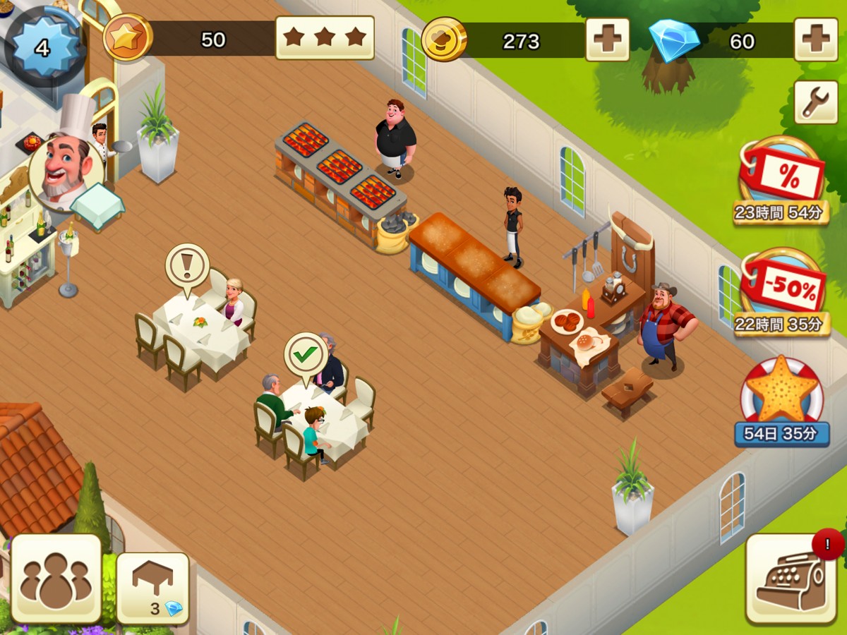 World Chefは料理するだけがメインのスマホアプリではありません。料理を提供する厨房のレイアウトや、お店の内装にまで気を配らなくてはいけません。必要となる厨房の設備やレストランのテーブルといったものは、お客様のオーダーに応えることでゲットできる経験値がないとできません。経験値を貯めるほど、レストランや厨房内部に配置できるものの自由度が高まっていきます。まるで箱庭のように、自分だけのこだわりのあるお店に仕立てていく楽しさがあります。レイアウトをセッティングしていく操作も非常にシンプルです。画面右下にあるレジマークをタップすると、シェフや設備といった配置できるもののリストが表示されます。後は配置したい場所にドラッグして置いてくるだけです。