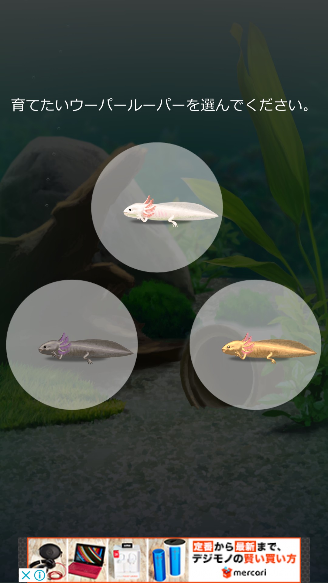 最初に3種類のウーパールーパーから、自分が育てたいものを選ぶことができます。