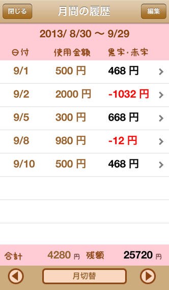 操作方法がシンプルなため細かいジャンル分けがされておらず、収入と支出が分かればいいという人におすすめです。一日単位、一か月単位の2つの画面で履歴の閲覧や削除ができ、赤字や黒字でチェックができるからお金の使い過ぎも簡単に分かります。