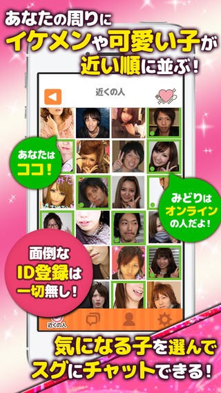 以上で登録は完了なのでとても簡単です。画面下の「近くの人」をタップすると、異性のの顔写真がずらりと出てきます。スクロールすれば次々に写真が出てきて、とても多くの人が登録している印象です。気になる人を見つけたら、プロフィールページのチャットボタンをタップしてメッセージを送ります。相手から返信が来れば、チャット内で会う場所や時間を決めて出会うことができる仕組みです。パスコードの設定もできるので、誰かに見られる心配もありません。