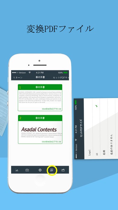 アプリを起動させ、左から2番目のカメラアイコンをクリックすると撮影開始です。撮影が完了すると、編集画面になります。四隅にある丸点を動かし、PDFに変換したい部分を選びます。選択が終了すれば、「次へ」をクリックします。下のメニュー画面で、画像の回転や明るさ、コントラスト、画像のサイズを変更可能です。調整が完了したら、「セーブ・保存」ボタンをクリックすると、データーは保存されます。