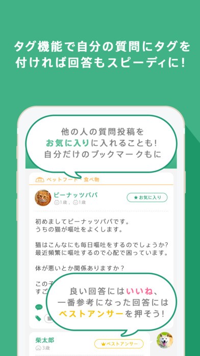 相談を投稿し、それに対して「ペット相談オンライン」のユーザーが回答するアプリです。